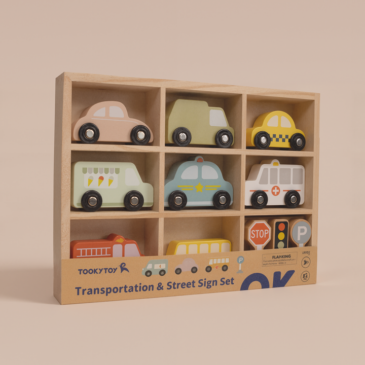 Featuring eight finely detailed wooden cars and three road signs, this charming set invites children to explore the world of vehicles, roads, and road safety through imaginative play. Each piece is painted in soft, muted tones and can be neatly stored in a wooden display box.