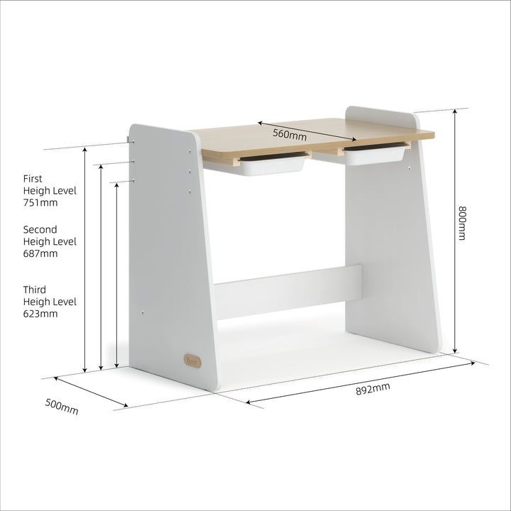 The desk features three adjustable heights (65cm, 70cm, and 75cm), providing versatility to accommodate children of different ages and sizes. Similarly, the chair is height adjustable with three settings (31cm, 36.5cm, and 42cm), allowing your little learner to grow with their furniture.