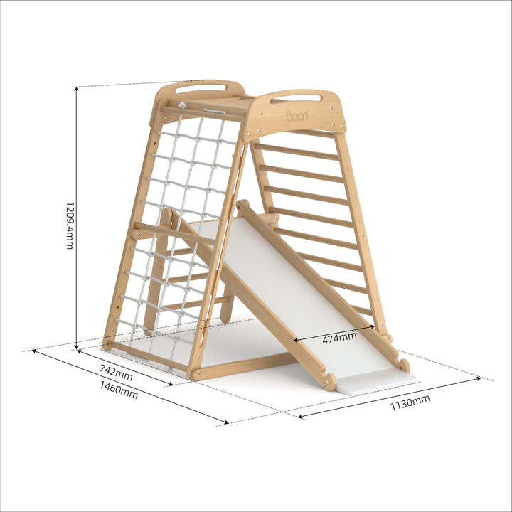A feature that sets our mini gym apart is the slide, ingeniously designed to flip and double as a climbing wall, challenging and enhancing your child's agility, balance, and strength. This toddler activity gym is thoughtfully created to foster both physical and imaginative growth, making it an essential addition to every playroom. Our additional extension piece adds a platform for the slide and extended climbing bars, meaning kids can share their mini gym adventures with one more friend.